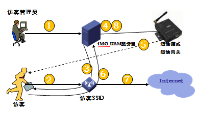 5) iMC EIA服務(wù)器通過短信貓或短信網(wǎng)關(guān)將帳號及密碼信息通過短信方式發(fā)送給訪客;