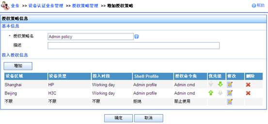 支持按場景分配授權(quán)策略,場景是設(shè)備位置區(qū)域、設(shè)備類型和接入時段的組合,可定義在不同場景下設(shè)備管理用戶所使用的Shell Profile和操作命令集。