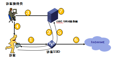 6) 訪客身份驗(yàn)證成功后,根據(jù)訪客接入控制策略控制訪問Internet及特定網(wǎng)絡(luò)資源;;